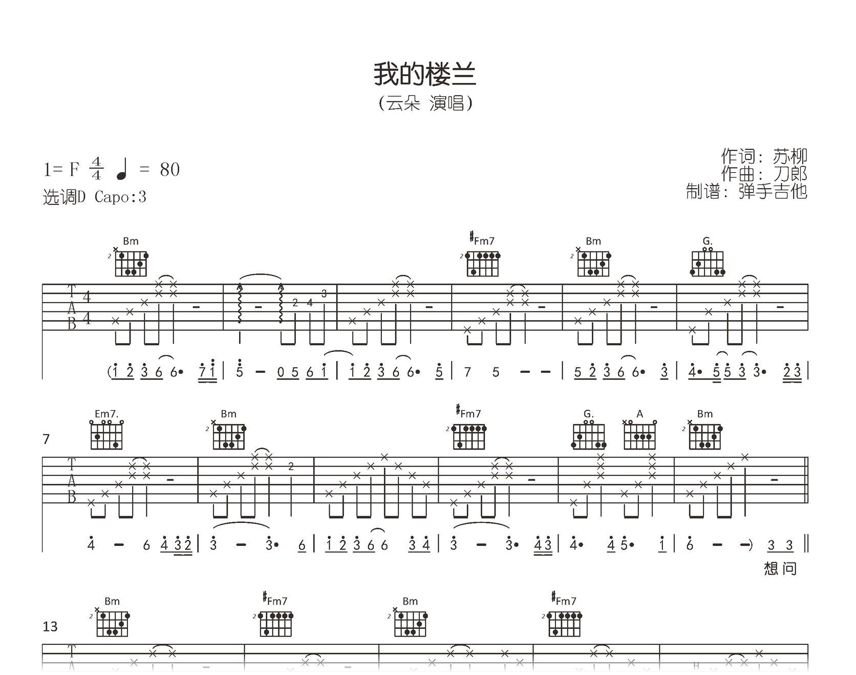 我的楼兰吉他谱,云朵演唱的一首经典代表歌曲,融合了浓郁的西域风情。《我的楼兰》吉他弹唱谱,原调F,选用D调指法,变调夹Capo3品,演奏速度每分钟80拍,吉他六线精编共三张高清图片谱例。