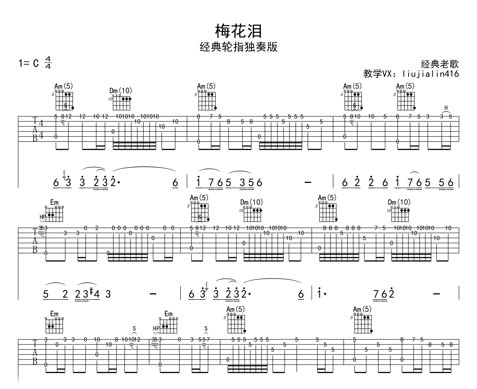 梅花泪指弹谱,新疆鬼手哥陈树彬老师经典吉他轮指独奏版,《梅花泪》吉他独奏谱,采用C调指法配合,完整编配共两张高清图片谱。随谱附上配套演奏示范音频,琴友们参照练习。